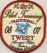This is the class patch for class 08-07 out of Columbus, MS. It shows the infamous tweet training aircraft and is modeled after a well know adult beverage. This was specially made for the current class and is a great hit on base.