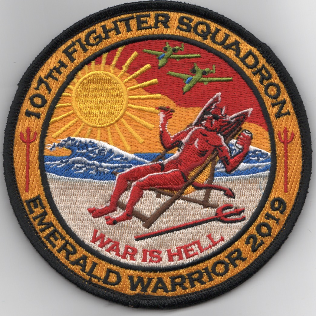 (Another AV8RSTUFF Creation): This is the 107FS 2019 ‘EMERALD WARRIOR’ det patch created for their participation in an exercise along the Gulf of Mexico. It shows one of the ‘Red Devils’ sunbathing under a scorching sun with the caption “”””WAR IS HELL”””” along the bottom. Their are also two A-10s flying over the waves of the Gulf. This patch does come with velcro attached.