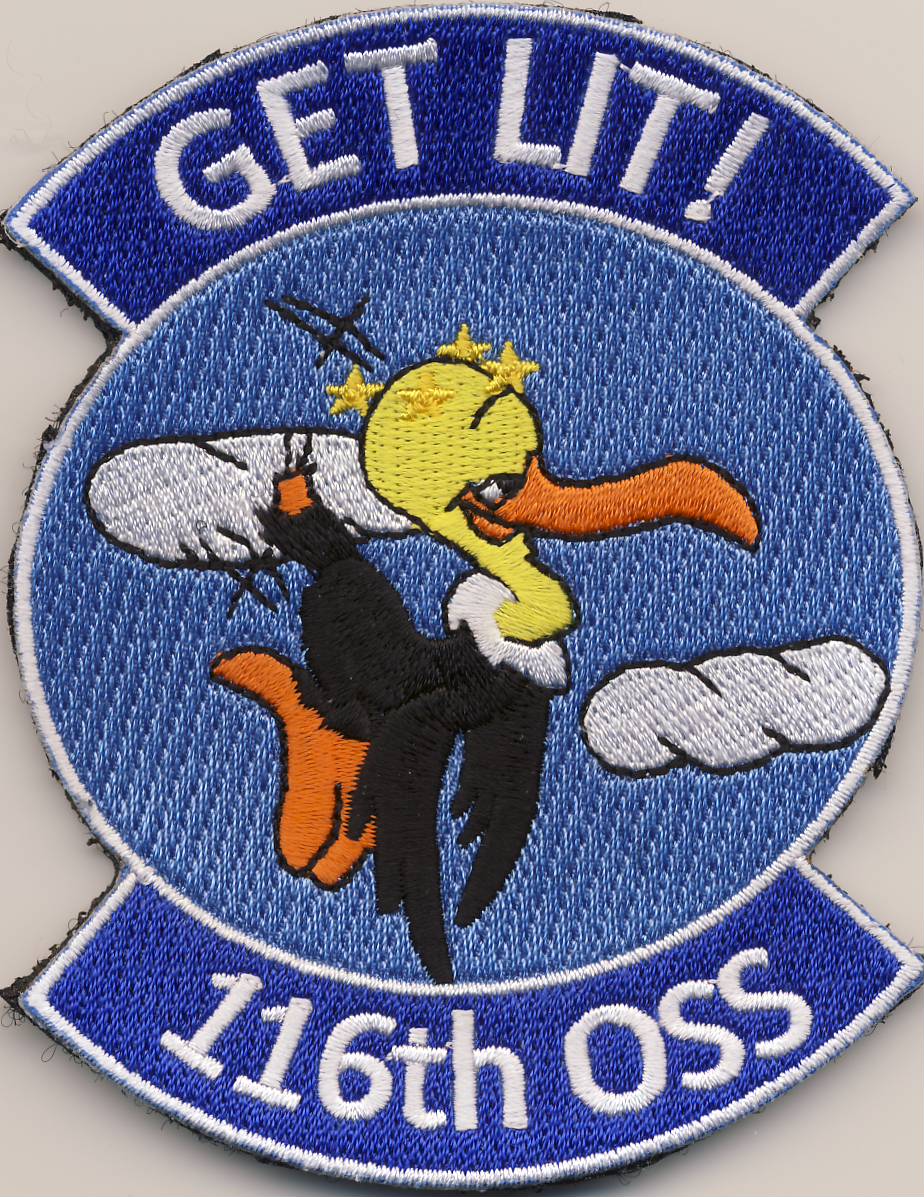 This is a custom patch for the 116th OSS. It shows a drunk bird flying around. On the top rocker it states, “GET LIT!” and on the bottom rocker it says, “116th OSS”. The patch is an “unauthorized” version of the squadron’s Friday morale patch. The 116th Operations Support Squadron, unlike a traditional base OSS, is responsible for the Joint Surveillance Target Attack Radar System (JSTARS) sortie and exercise scheduling, flight analyses, mission intelligence, tactics, and aircrew training preparation. These duties include long-range mission scheduling, building and executing exercises and deployments, aircraft software or modification training, and providing the necessary tactics and intelligence analyses to ensure wing mission success. This patch comes with velcro attached.