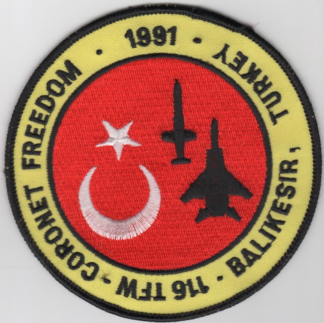 This is the 1991 Coronet Freedom patch created for the 116TFW detachment to Balikesir, Turkey. This is an original patch, not some reproduction. They were found (in very limited supplies) in a trunk at the squadron during their 75th Anniversary celebration in July 2016. Get one while they last, as these originals will be gone soon. This patch does not come with velcro attached.