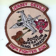 This is the desert version of the “Jersey Devils” deployment patch created for the 119th Fighter Squadron that flies the F-16 (version unknown) located out of New Jersey. They flew out of Balad, IRAQ during their last deployment with a mix of NJ/PA/VT jets. All three states’ Guard units will be using those aircraft.