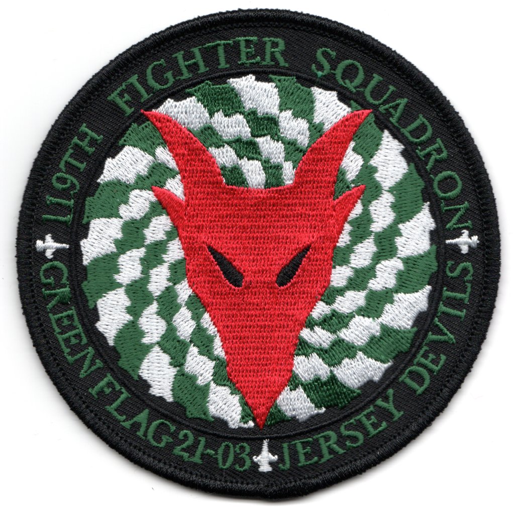 (From the squadron supplier): The 119FS is a unit of the New Jersey ANG 177th Fighter Wing located at Atlantic City ANGB, NJ. The 119FS is equipped with the F-16 Fighting Falcon aircraft, with lineage as a descendant organization of the World War I 5th Aviation School Squadron (later 119th Aero Squadron), established on 5 June 1917. It was reformed on 30 January 1930, as the 119th Observation Squadron, and is one of the 29 original National Guard Observation Squadrons of the United States Army National Guard formed before World War II. This patch was created for their participation in Operation GREEN FLAG 21-03 at Nellis AFB, NV and does not come with velcro attached.
