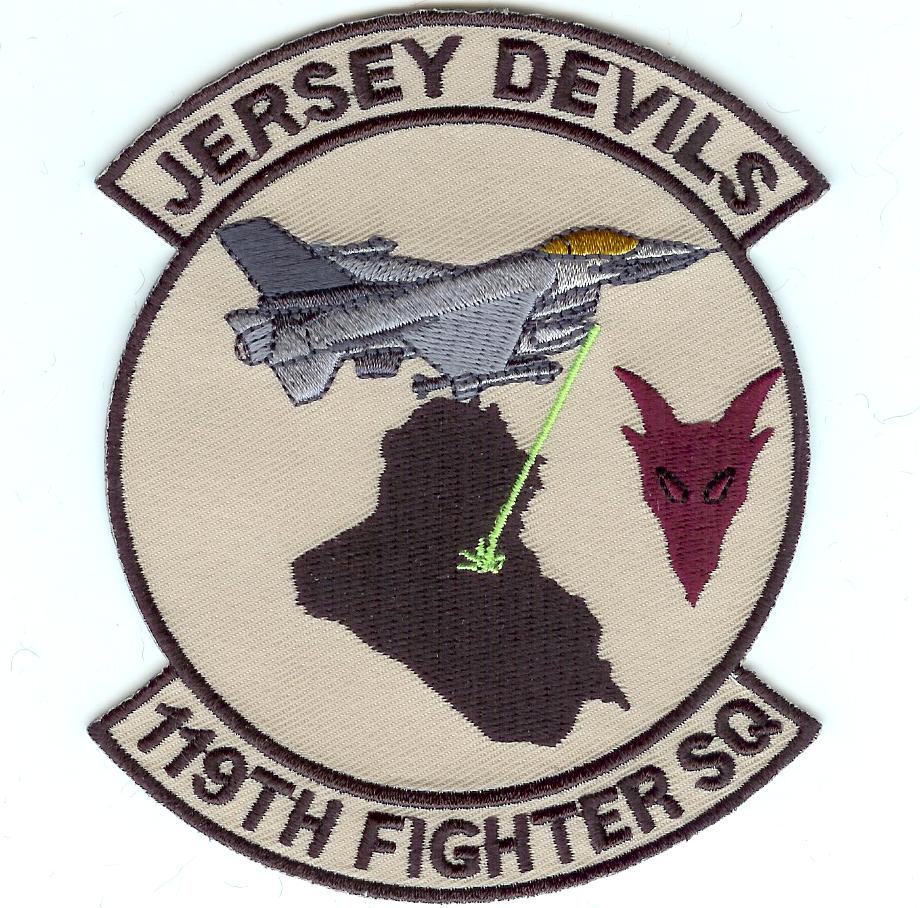 This is the desert version of the “Jersey Devils” squadron patch created for the 119th Fighter Squadron that flies the F-16 (version unknown) located out of New Jersey. They flew out of Balad, IRAQ during their last deployment with a mix of NJ/PA/VT jets. All three states’ Guard units will be using those aircraft. The 119th belong to the 177 FW of the NJ ANG out of Atlantic City IAP. The unit is currently flying the F-16C Block 25.