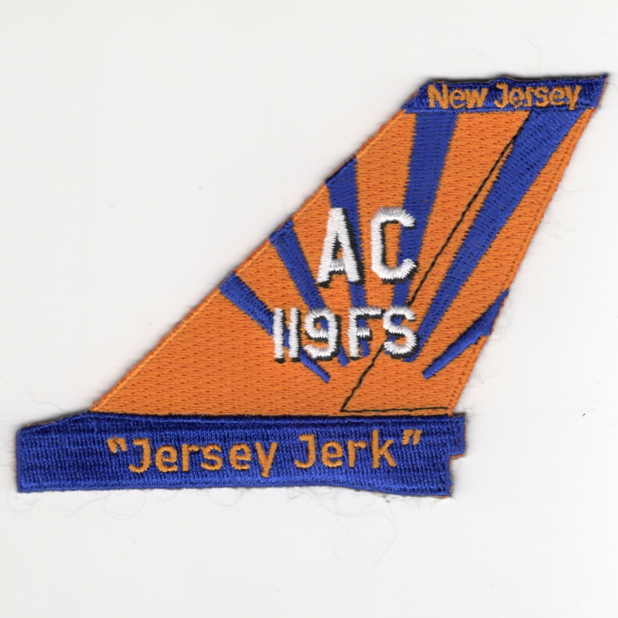This is the F-16 TAILFIN Patch created for the 119FS. It says “JERSEY JERK” at the bottom with a tail code of “AC”. This orange-blue version does not have velcro attached.