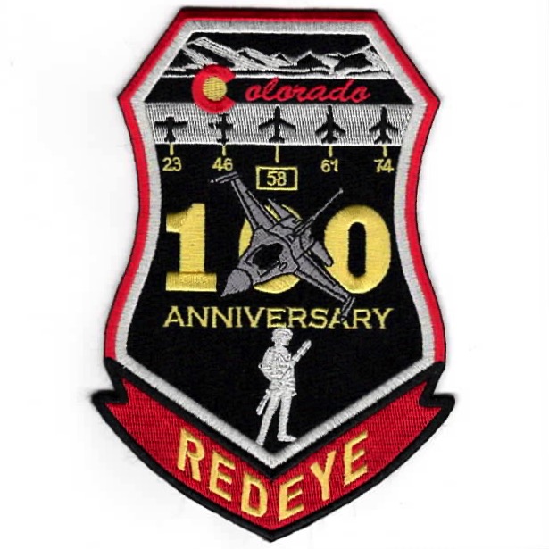 This is the *100 ANNIVERSARY* shield patch created by the 120th Fighter Squadron, the Colorado Air NationalGuard unit that flies the F-16C+ out of Buckley AFB in Denver, CO. This patch does not come with velcro attached.
