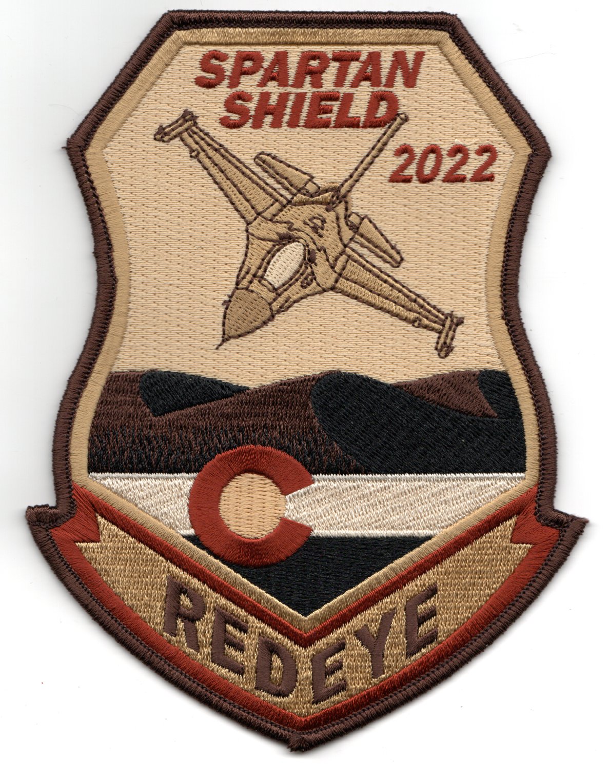 This is the very large, desert version of the “2022 SPARTAN SHIELD” patch for the 120FS, the Colorado Air National Guard unit that flies the F-16C+ out of Buckley AFB in Denver, CO. This patch does not come with velcro attached.