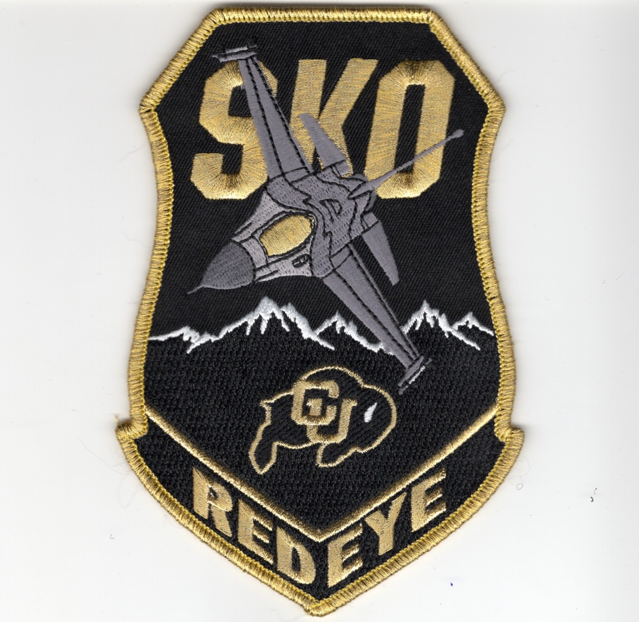 This is the “REDEYE” shield patch for the 120th Fighter Squadron, the Colorado Air National Guard unit that flies the F-16C+ out of Buckley AFB in Denver, CO…..notice the “gold” canopy and the COLORADO BUFFALOS mascot/colors on this version. The actual aircraft has a thin film on the inside of the canopy for radiation protection. This patch does not come with velcro attached.