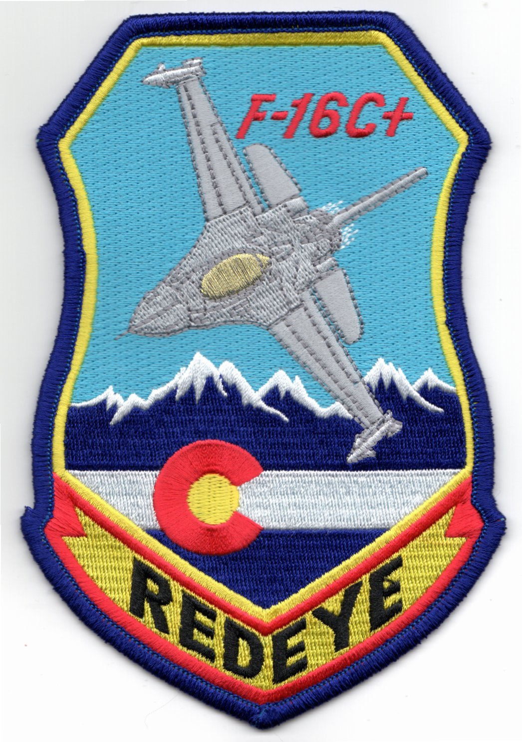This is the “REDEYE” shield patch for the 120th Fighter Squadron, the Colorado Air National Guard unit that flies the F-16C+ out of Buckley AFB in Denver, CO…..notice the “gold” canopy on this version. The actual aircraft has a thin film on the inside of the canopy for radiation protection. This patch does not come with velcro attached.