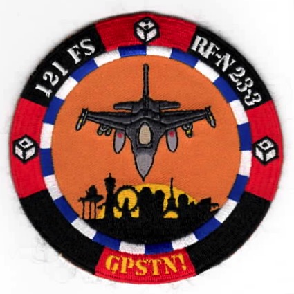 The 121st Fighter Squadron (121 FS) is a unit of the District of Columbia Air National Guard 113th Wing located at Joint Base Andrews, Camp Springs, Maryland. The 121st is equipped with the Block 30 F-16C/D Fighting Falcon. This is their “Red Flag 23-3” participation patch that says “GPSTN!” (Guardian Pride Second To None) and does not have velcro.