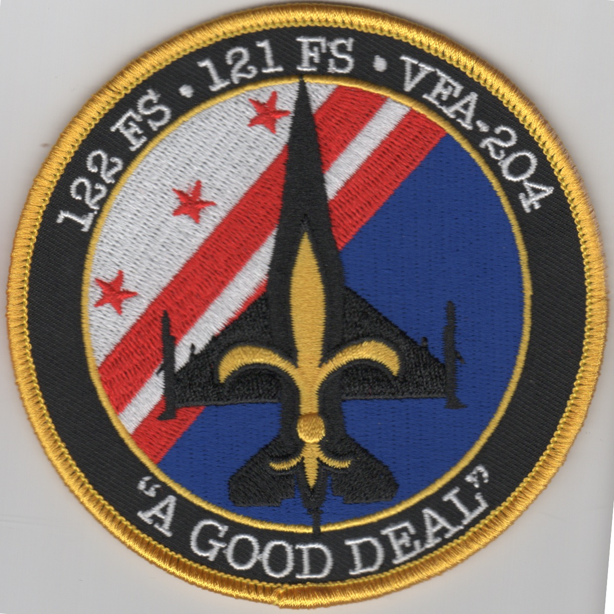 This is the detachment patch created for the 121FS, 122FS and the Navy’s VFA-204 squadrons. It must have been an exercise in LA, as it shows the SAINTS (and Louisiana’s) Flour-de-Lis. It says “A GOOD DEAL” along the bottom and does not have velcro.