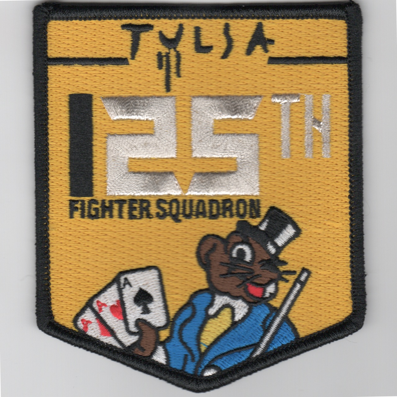 The 125th Fighter Squadron (125FS) is a unit of the Oklahoma Air National Guard, stationed at the Tulsa Air National Guard Base at Tulsa International Airport in Tulsa, Oklahoma. When activated to federal service as a United States Air Force unit, the 138 FW is gained by the Air Combat Command (ACC). This patch (shield) is their 25th Anniversary patch and does not have velcro.
