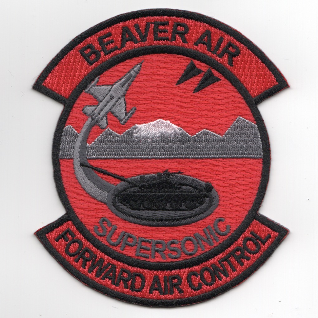 This is the red version of the FAC(A) ‘Beaver Air’ patch created the Tulsa, OK Air National Guard unit that flies the F-16CM variant under the guidance of the 138th Fighter Wing/125th Fight Squadron. This patch shows an F-16 coming “off target” (of a tank) and says “SUPERSONIC” underneath. This patch does not come with velcro attached.
