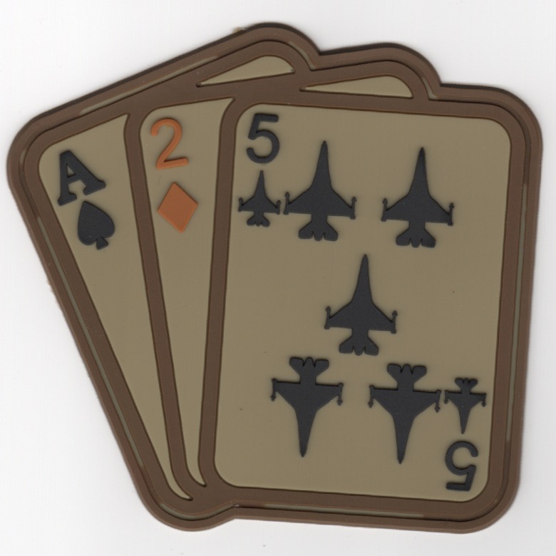 The 125th Fighter Squadron (125 FS) is a unit of the Oklahoma Air National Guard 138th Fighter Wing located at Tulsa Air National Guard Base, Oklahoma. They are equipped with the Block 42 F-16C Fighting Falcon. The squadron is a descendant organization of the 125th Aero Squadron, established on 30 July 1940. It was one of the 29 original National Guard Observation Squadrons of the United States Army National Guard formed before World War II. This is the desert-colored PVC (rubber/vinyl) version of their “Ace-2-5 cards” squadron patch they wear on Fridays. This patch does not have velcro on the back.