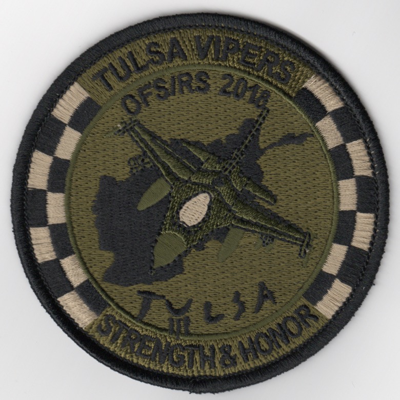 The 125th Fighter Squadron (125FS) is a unit of the Oklahoma Air National Guard, stationed at the Tulsa Air National Guard Base at Tulsa International Airport in Tulsa, Oklahoma. When activated to federal service as a United States Air Force unit, the 138 FW is gained by the Air Combat Command (ACC). This is their OD (subdued) Green version of their patch is for their OFS/RS 2018 Det, states “STRENGTH AND HONOR” along the bottom, and does not have velcro.