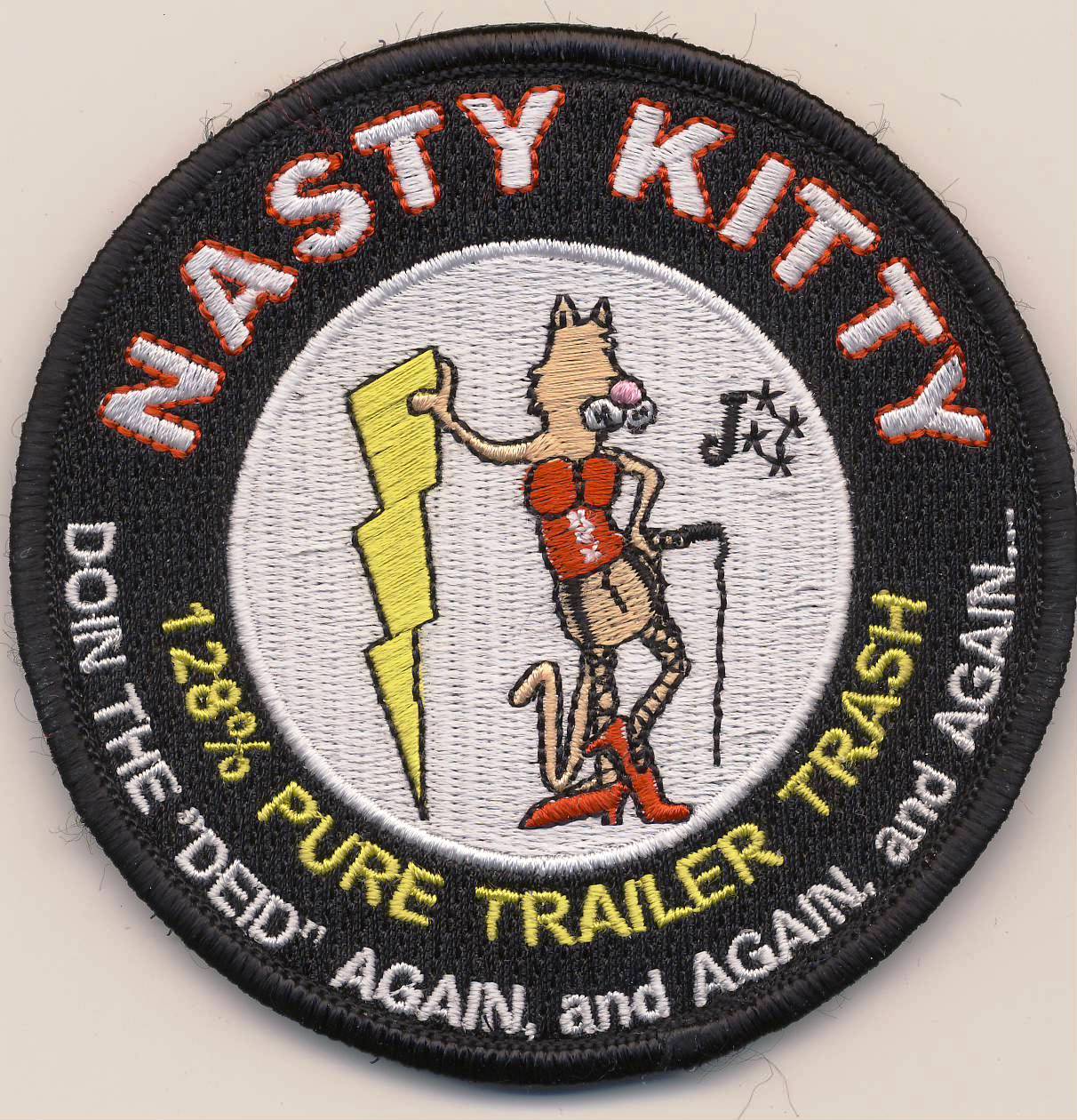 This is a morale patch for the 128 ACCS GA ANG JSTARS unit at Robins AFB, GA. It shows a porno-looking cat in the center of the patch. “NASTY KITTY” and “Doin the Deid again, and again and again . . . ” ring the outer boarder of the patch. The words “128% Pure Trailer Trash are in the inner part of the center circle. This patch was designed by TSgt Tracie Gross from the 128th ACCS. This patch comes with velcro attached.