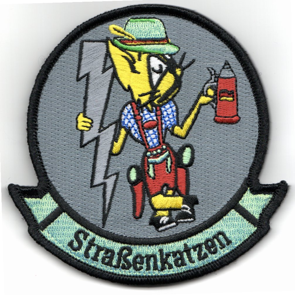 (Another AV8RSTUFF Creation): This is the neon, FRIDAY version of the deployed squadron patch for the 128 ACCS / 10 Expeditionary ACCS that has the “German script” at the bottom. They deployed to a NATO country and instead of the cigar in the left paw, he’s holding a beer stein. This patch DOES come with velcro attached.
