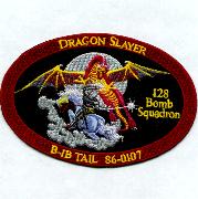 This is the Nose Art for the GA ANG B-1, Tail 86-0107. This shows “Mr. Bones” as a knight on horseback fighting the Dragon. This is “The DRAGON SLAYER”. The B-1 has since been taken away from the GA ANG and given back to the active duty units, so these have become quite collectible. If you want an entire set of all 9 patches, just order ONE and send me a note and I’ll take care of it. This patch does not come with velcro attached.