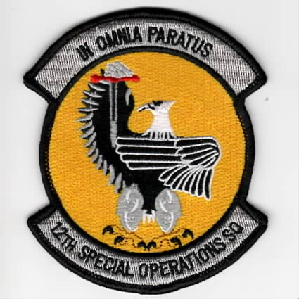 (Another AV8RSTUFF Creation): The 12th Special Operations Squadron (SOS) is assigned to the 27th Special Operations Group at Cannon AFB, NM. Its mission is the launch and recovery of MQ-9 Reaper Remotely Piloted Aircraft from unprepared locations throughout the world. The squadron was activated in 2015 to replace a detachment that had been performing the same mission since October 2013. The squadron was previously active at Elmendorf AB, AK as the 12th Fighter Squadron, part of the 3d Operations Group. The squadron operated the McDonnell Douglas F-15 Eagle aircraft conducting air superiority missions. The mission of the 12SOS is to launch and recover Remotely Piloted Aircraft (RPA) operationally employed by the 2d, 3d and 33d Special Operations Squadrons. This is the yellow version of their current squadron patch that says “IN OMNIA PARATUS” (top) and does not come with velcro attached.
