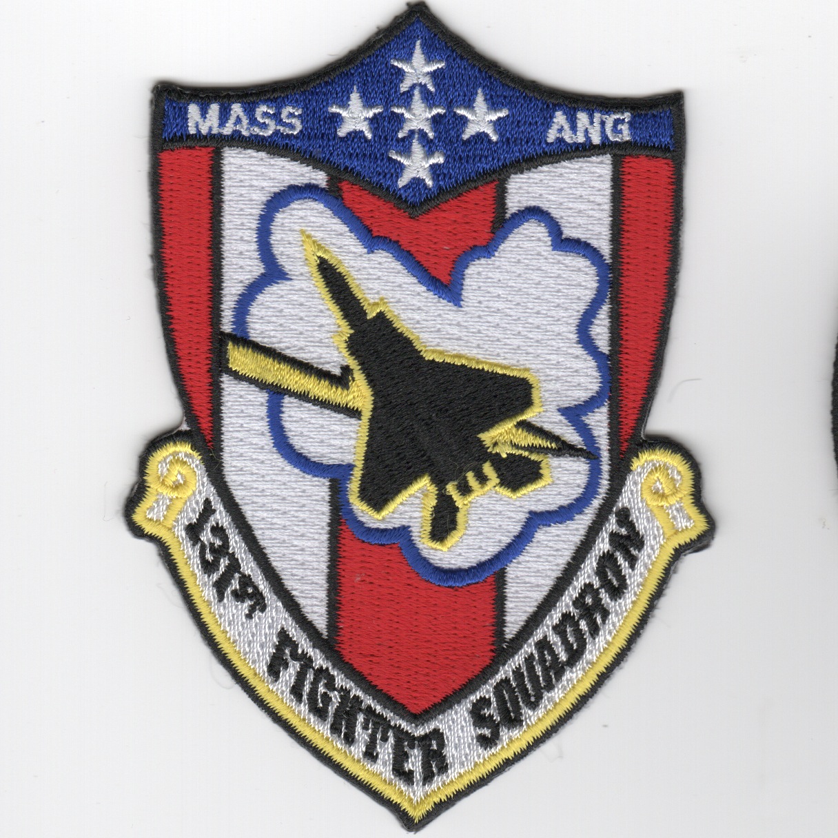 This is the “red-white-blue” version of the ‘SHIELD’ patch for the 131FS. The 131st Fighter Squadron (131 FS) is a unit of the Massachusetts Air National Guard 104th Fighter Wing located at Barnes Air National Guard Base, Westfield, MA. The 131st is equipped with the F-15C/D Eagle. This patch does not have velcro attached.