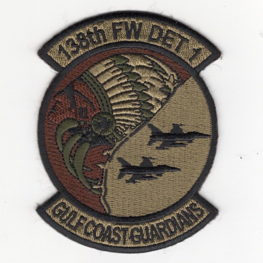 This patch was created for the 138th Fighter Wing Detachment-1’s exercise. It says “Gulf Coast Guardians” along the bottom, showing the “region” they were operating/protecting. This OCP version of their squadron patch shows the “INDIAN BONNET” on left half, the F-16 VIPERS on the right half and might have been a part of the Operation Noble Eagle. This patch does not come with velcro attached.