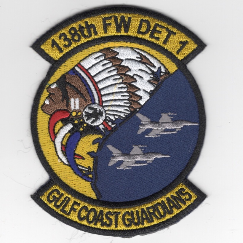 This patch was created for the 138th Fighter Wing Detachment-1’s exercise. It says “Gulf Coast Guardians” along the bottom, showing the “region” they were operating/protecting. This Yellow-Blue version of their squadron patch shows the “INDIAN BONNET” on left half, the F-16 VIPERS on the right half and might have been a part of the Operation Noble Eagle. This patch does not come with velcro attached.