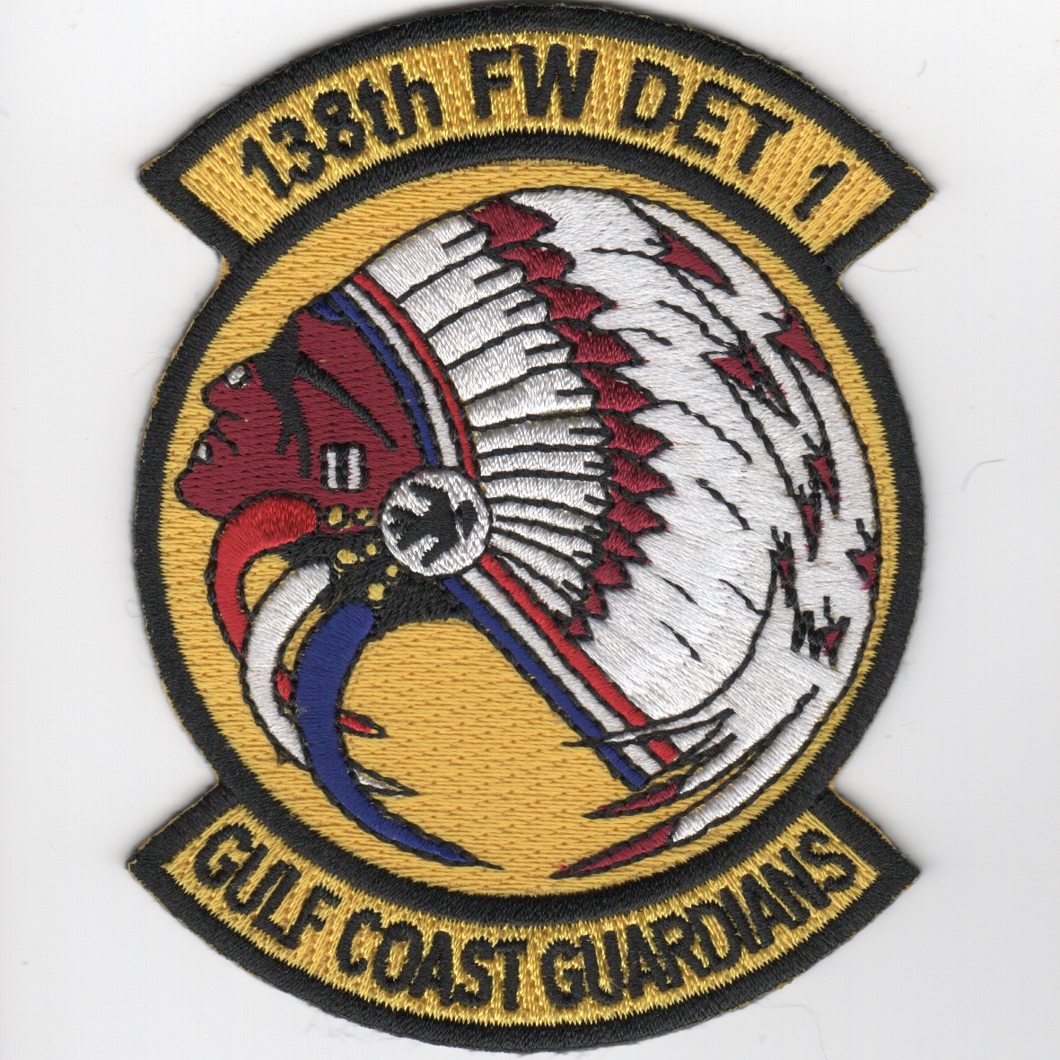 This patch was created for the 138th Fighter Wing Detachment-1’s exercise. It says “Gulf Coast Guardians” along the bottom, showing the “region” they were operating/protecting. This yellow version of their squadron patch shows the “INDIAN BONNET” (ONLY) and might have been a part of the Operation Noble Eagle. This patch does not come with velcro attached.
