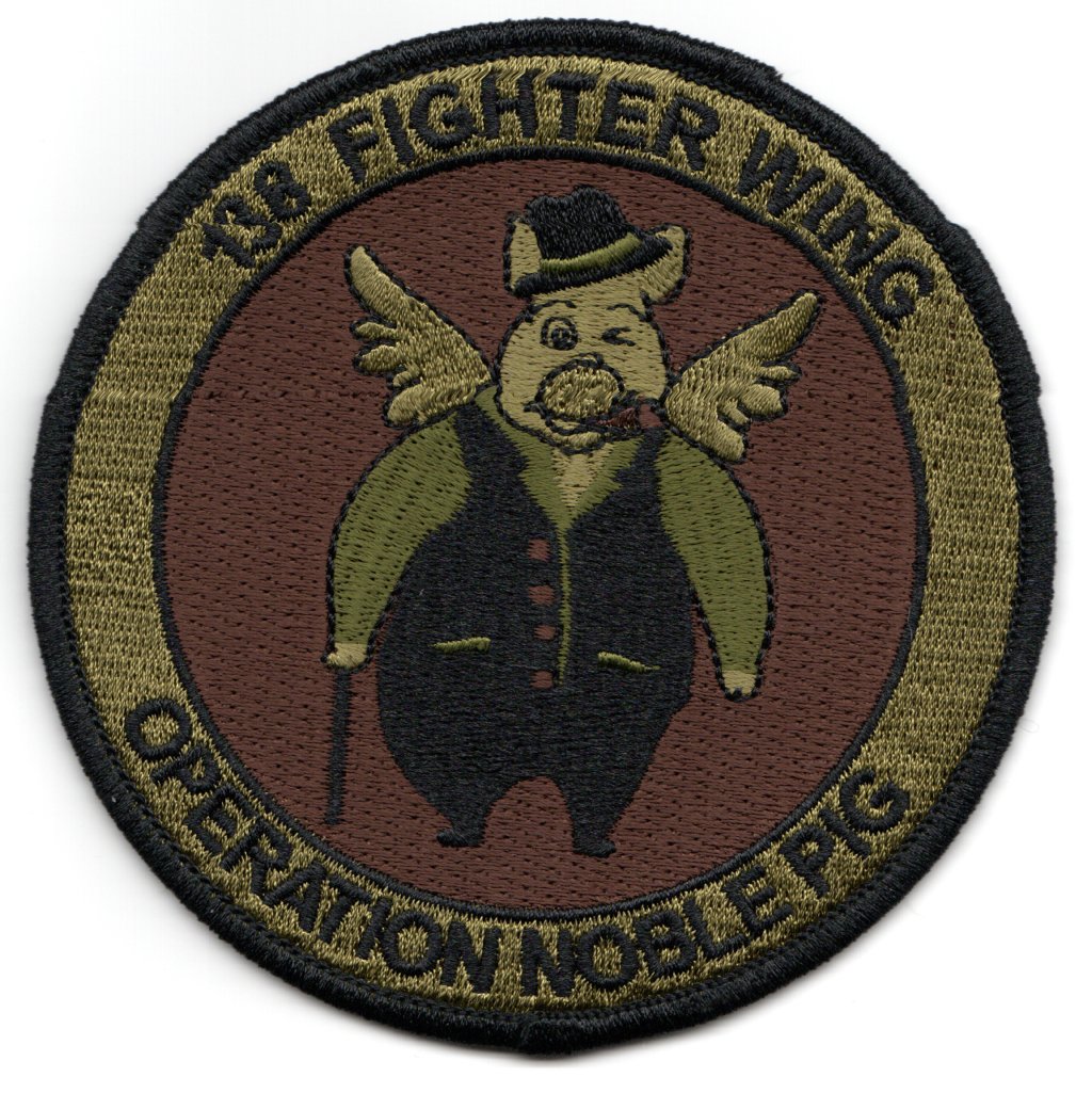 The 138th Fighter Wing (138 FW) is a unit of the Oklahoma Air National Guard, stationed at the Tulsa Air National Guard Base at Tulsa International Airport in Tulsa, Oklahoma. When activated to federal service as a United States Air Force unit, the 138 FW is gained by the Air Combat Command (ACC). This is the subdued/OCP version of the patch that was created for their participation in ‘Operation NOBLE PIG’ and does not have velcro.