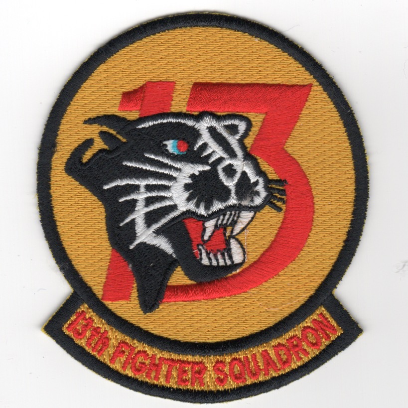 (Korean): The 13FS is a fighter squadron of the USAF flying the General Dynamics F-16 Fighting Falcon and is part of the 35FW at Misawa Air Base, Japan. The squadron traces its heritage back to the 1942 activation of the 313th Bombardment Squadron. The squadron served in the United States as a training unit until its 1943 inactivation. The squadron was reactivated in 1966 as the 13TFS, fighting in the Vietnam War. The squadron flew Wild Weasel anti-SAM missions with the Republic F-105 Thunderchief and McDonnell Douglas F-4 Phantom II, operating out of Korat Royal Thai Air Force Base. The squadron moved to Udorn Royal Thai Air Force Base in October 1967, flying F-4s in combat air patrols against North Vietnamese MiGs and ground strike missions. The squadron was then inactivated with the end of the war in 1975. The squadron was reactivated in 1976 as a training squadron at MacDill AFB, FL, and then inactivated again in 1982. The squadron was (again) reactivated as the 13TFS in 1985 at Misawa, flying the F-16, finally being redesignated the 13th Fighter Squadron in 1991. This patch was found in a Korean embroidery shop in very limited quantities and does not come with velcro attached.