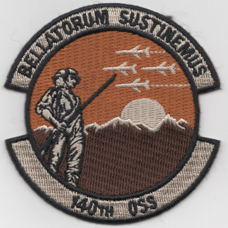 This is the desert version of the 140th Operational Support Squadron (OSS) crest out of Buckley AFB, CO. This patch says “BELLATORUM SUSTINEMUS” (top) and does not come with velcro attached.