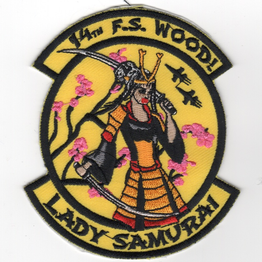 (Korean): The 14FS is part of the 35FW at Misawa Air Base, Japan. They operate the F-16 Fighting Falcon aircraft conducting Wild Weasel missions. The squadron has been stationed at Misawa since 1987. The squadron was deactivated, but then reactivated in 1987 as the 14TFS at Misawa Air Base, initially training for close air support using conventional weapons. They also provided for the air defense of northern Japan. The squadron has provided personnel and aircraft to support operations in Iraq and Afghanistan. This patch is the “LADY SAMURAI” version of their squadron patch and was found in a Korean embroidery shop in very limited quantities. This patch does not come with velcro attached.