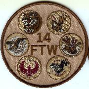 This is the desert version of the “gaggle” patch for the 14th Flying Training Wing. The 14th FTW conducts pilot training for the U.S. Air Force and international officers, using a fleet of T-37, T-38, and T-1 aircraft and flight simulators. They are located at Randolph AFB, TX.