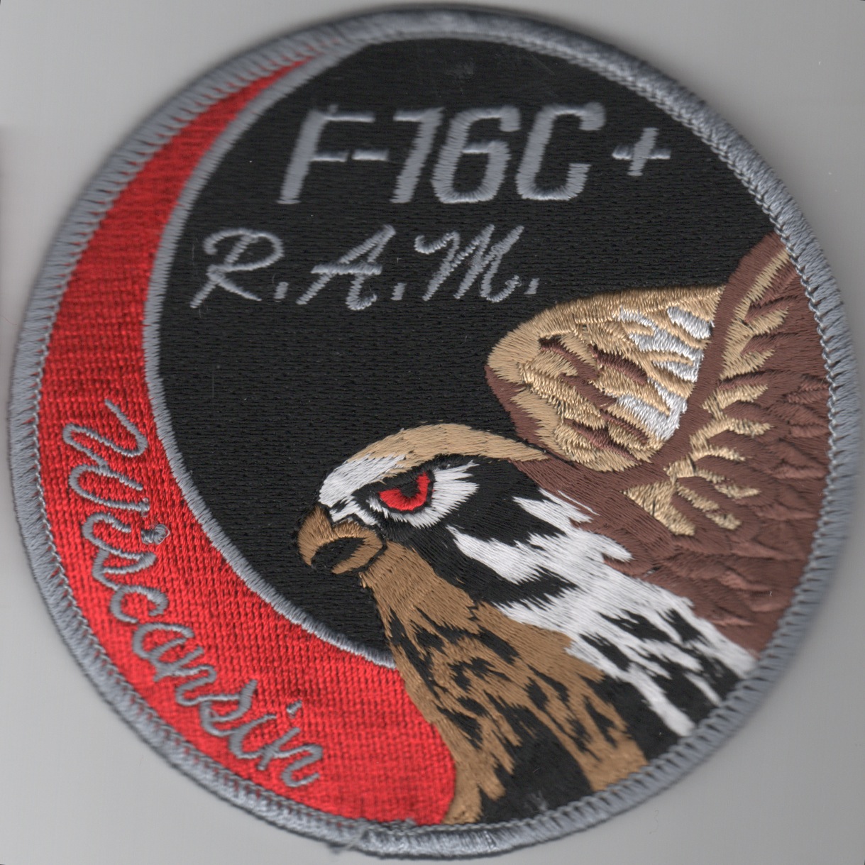 This is the R.A.M. F-16C+ ‘SWIRL’ patch for the 176th Fighter Squadron that flies the Viper for the WI Air National Guard out of Madison, WI. According to their history, “RAM” stands for “RAGGI * DIEASSM * ILITIA”…….love the “heritage” tip-o-the-hat patches like this one. It does not come with velcro attached.