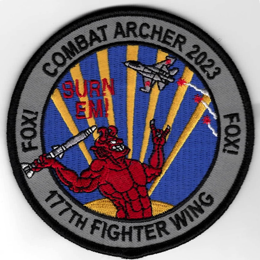 The 177th Fighter Wing (177 FW) is a unit of the New Jersey ANG, stationed at Atlantic City ANG Base, NJ. When activated to federal service, the Wing is gained by the USAF ACC. The 119FS assigned to the Wings 177th Operations Group, is a descendant organization of the World War I 5th Aviation School Squadron (later 119th Aero Squadron), established on 5 June 1917, then was reformed on 30 January 1930, as the 119th Observation Squadron, and is one of the 29 original National Guard Observation Squadrons of the United States Army National Guard formed before World War II. This is the patch they created for the COMBAT ARCHER 2023 Exercise that takes place at Tyndall AFB, FL and hosted by the 325FW. This patch does not come with velcro attached.