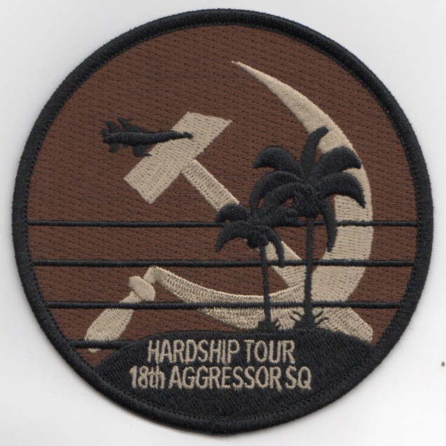 This is the ‘desert’ version of the ‘HARDSHIP TOUR’ Det patch for the 18th Aggressor squadron for one of their deployments in support of the combat Air Force, joint and allied aircrews through challenging, realistic threat replication, training, test support, and academics. This patch does not have velcro attached.