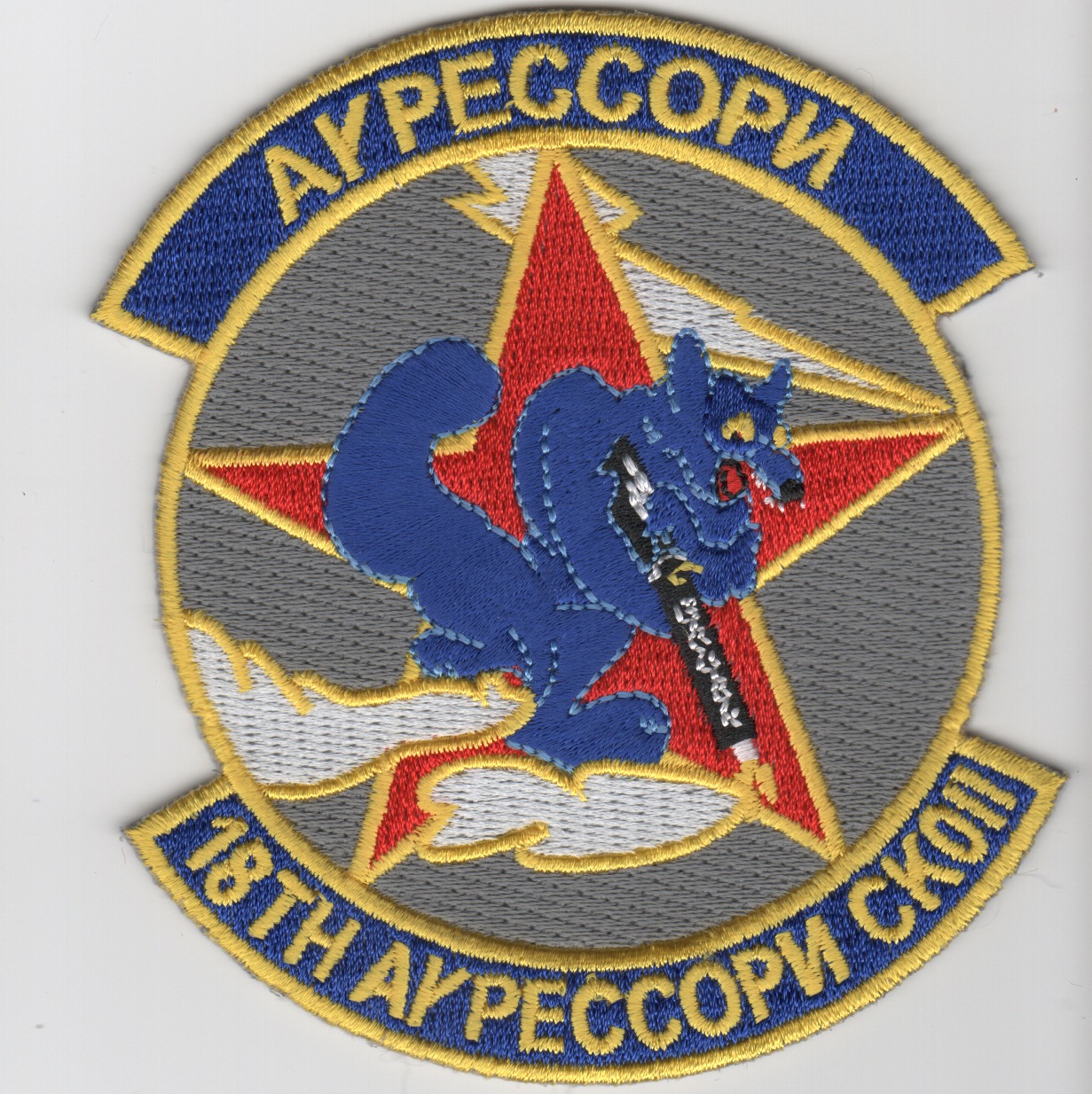 This is the Russian/Cyrilic version of the squadron patch for the 18th Aggressor squadron. They prepare the combat Air Force, joint and allied aircrews through challenging, realistic threat replication, training, test support, and academics.