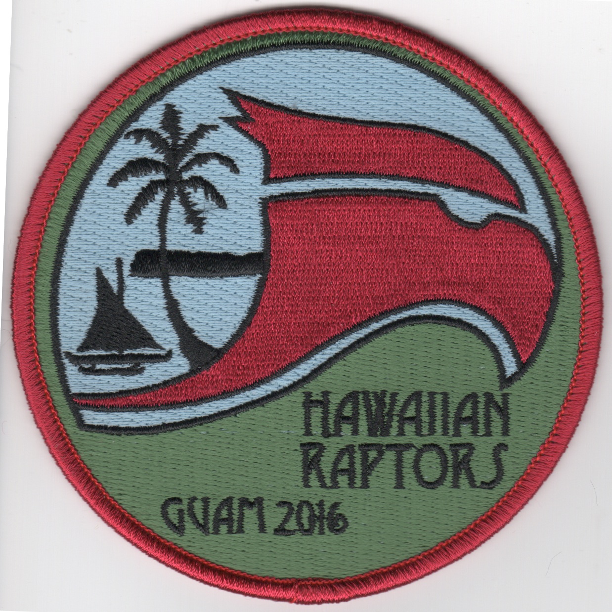 This is a detachment patch created for the 19FS/199FS who fly the F-22 Raptor for their latest exercise at Guam. It says “”””Hawaiian Raptors”””” along the bottom and has the “”””red Raptor beak””””. This patch does not have velcro attached.
