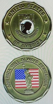 (From the official NEX / BX Supplier #2248): FRONT: This coin says ‘UNITED STATES’ (top), ‘OF AMERICA’ (bottom), and the POW/MIA logo in the middle with colored epoxy. BACK: This coin says ‘AMERICA WILL ALWAYS REMEMBER’ with the Statue of Liberty in the center.