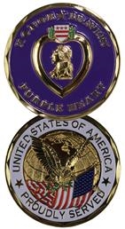 (From the official NEX / BX Supplier #2263): FRONT: This coin has the famous logo and says ‘PURPLE HEART’ (bottom) with purple enamel. BACK: Says ‘UNITED STATES OF AMERICA’ (top) and ‘PROUDLY SERVED’ (bottom) in white enamel.