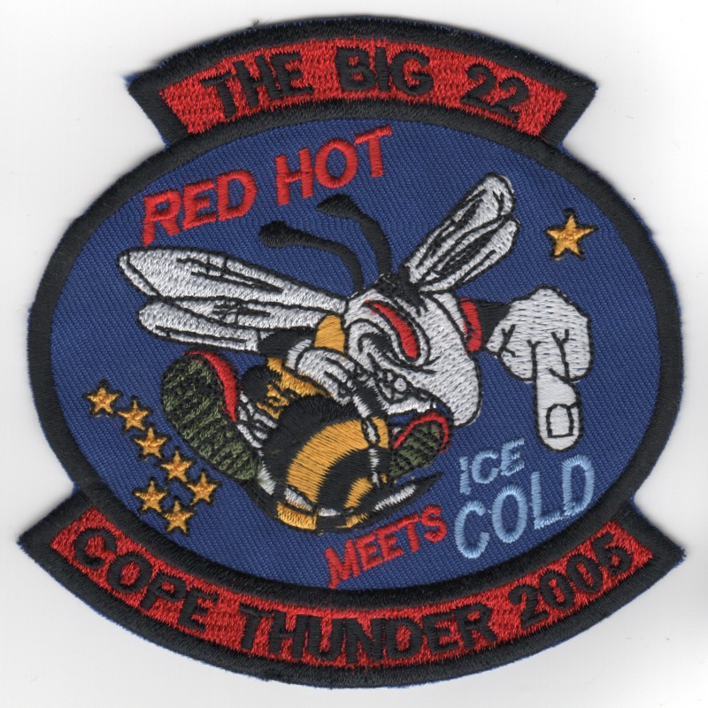 (Korean): The 22d Fighter Squadron is an inactive United States Air Force unit. They were last assigned to the 52d Operations Group and stationed at Spangdahlem Air Base, Germany. In April 2010, 20 F-16Cs were flown from Spangdahlem to the 148FW of the MN ANG, with one F-16 transferred to Edwards Air Force Base, CA. As a result of the drawdown of F-16s, the 22d and 23rd Fighter Squadrons were inactivated on 13 August 2010 and formed a single “new” squadron, the 480FS. At various times during its existence, the squadron has gone by colloquial names “Stingers”, “Adlers”, “Bees”, “Bumblebees” and “The BIG 22: Last of the Red Hot Fighter Squadrons. This patch is the 2005 ‘COPE THUNDER’ Exercise patch found in a Korean embroidery shop in very limited quantities and does not come with velcro attached.