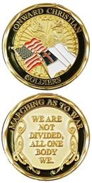 (From the official NEX / BX Supplier #2428): FRONT: Says ‘ONWARD CHRISTIAN’ (top), SOLDIERS (bottom), and has the American and Christian Flags (middle). BACK: Says ‘MARCHING AS TO WAR’ (top) and ‘WE ARE NOT DIVIDED….’ (middle).