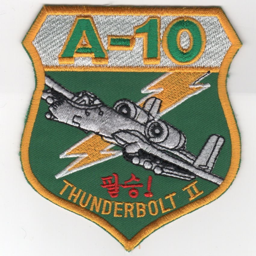 (From the Squadron supplier:) For the 25FS history, see the details listed above. This is the green-yellow version of the A-10 ‘THUNDERBOLT II’ crest that has red Korean letters at the bottom. This patch was found in a Korean embroidery shop in very limited quantities and does not come with velcro attached.