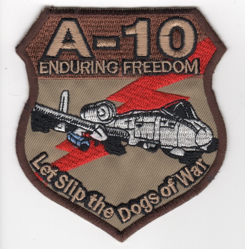 (From the Squadron supplier:) For the 25FS history, see the details listed above. This is the desert version of the A-10 ‘crest’ that says ENDURING FREEDOM (top) and ‘LET SLIP THE DOGS OF WAR’ (bottom) and depicts the aircraft “loaded for bear”. This patch was found in a Korean embroidery shop in very limited quantities and does not come with velcro attached.