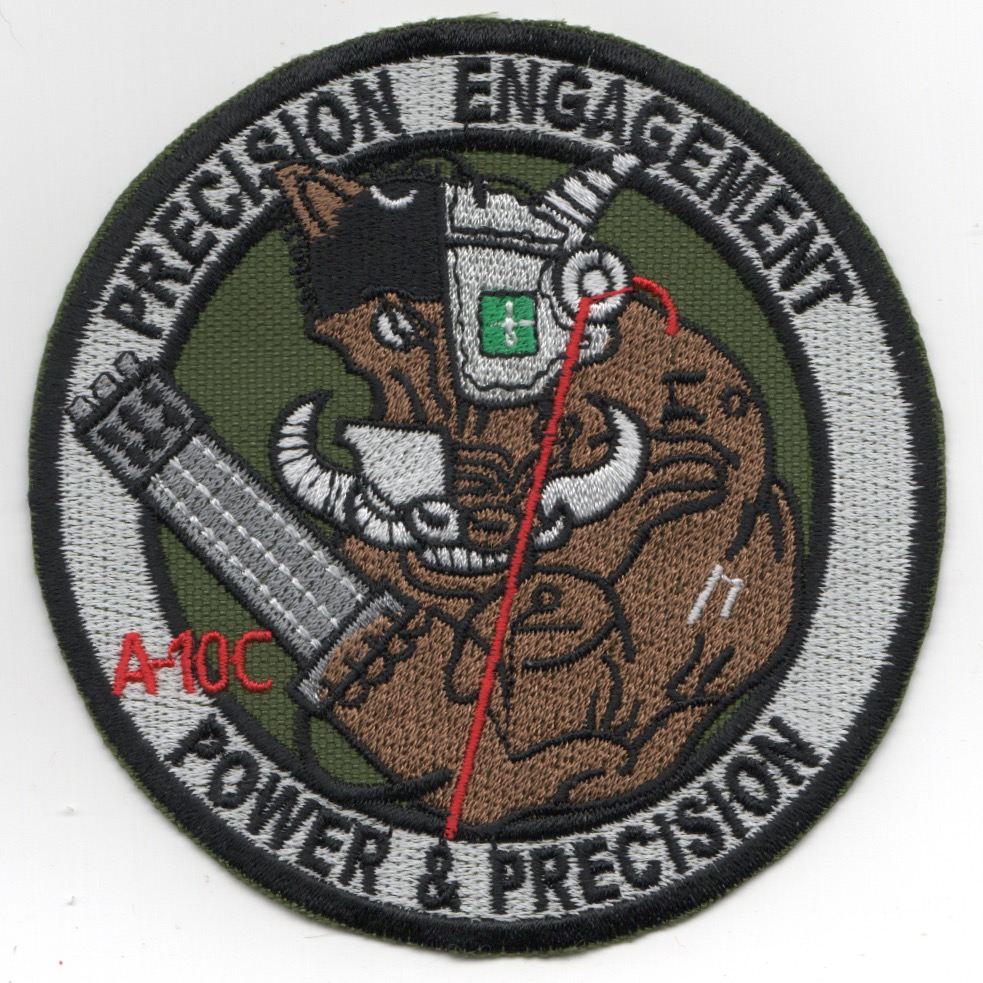 (From the Squadron supplier:) For the 25FS history, see the details listed on Page 1. This is the A-10C Warthog patch that says PRECISION ENGAGEMENT (top) and POWER AND PRECISION (bottom) with their mascot holding their 30mm cannon. This patch was found in a Korean embroidery shop in VERY limited quantities and does not come with velcro attached.