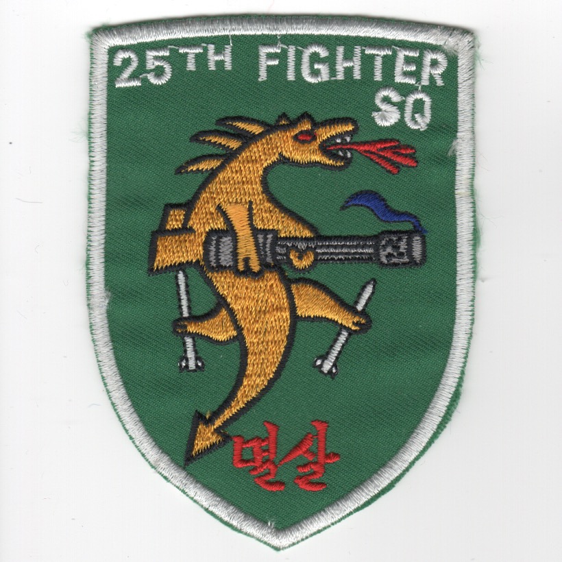 (From the Squadron supplier:) The 25FS is part of the USAF’s 51OG, 51FW, at Osan Air Base, South Korea. They operate the Fairchild Republic A-10 Thunderbolt II aircraft conducting close air support missions. On 28 January 1982, the 25FS received its first Fairchild Republic A-10 Thunderbolt II aircraft. The squadron’s presence helped maintain a peaceful armistice between North and South Korea until 2 October 1989. It was during that time that the 25th began transferring aircraft to the 19th Tactical Air Support Squadron and other stateside units. The 25th was then inactivated on 1 July 1990. On 1 October 1993, the 25FS was reactivated under the 51st Wing at Osan Air Base, Republic of Korea, and has since added six A-10 aircraft to its fleet, making it a dual qualified A/OA-10 squadron. This is the ‘Medium GREEN’ version of the ‘shield’ patch depicting the Dragon with the 30mm Gatlin Gun and was found in a Korean embroidery shop in very limited quantities. This patch does not come with velcro attached.