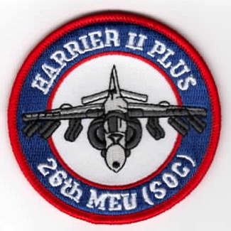 The 26th Marine Expeditionary Unit (Special Operations Capable) (26th MEU (SOC)) is 1 of 7 Marine Expeditionary Units currently in existence in the USMC. It is an air-ground task force with a strength of about 2,400 personnel when at full strength during a deployment. It consists of four major parts: a command element, a ground combat element, an aviation combat element, and a logistics combat element. Since its establishment in the early 1970s as the 26th Marine Amphibious Unit, it has deployed extensively and participated in numerous combat and contingency operations, as well as training exercises. The 26th MEU (SOC) is based out of Camp Lejeune, NC. This patch is in the R/W/B colors for the HARRIER pilots that fly in this MEU and does not come with velcro attached.