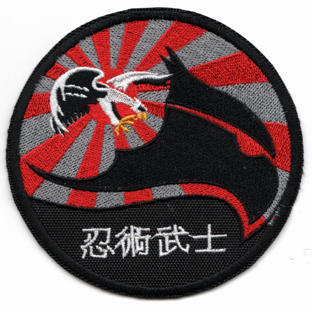 (Korean): For the history and lineage of the 27FS, please note the details above. This patch shows the ‘Raptor’ with it’s Talons in attack position behind the head of a black bird-head with the red-GRAY rays of the setting sun typical of the Pacific theater in the background with Korean script (different than that one below) along the bottom. This patch was found in a Korean embroidery shop in very limited quantities and does not come with velcro attached.