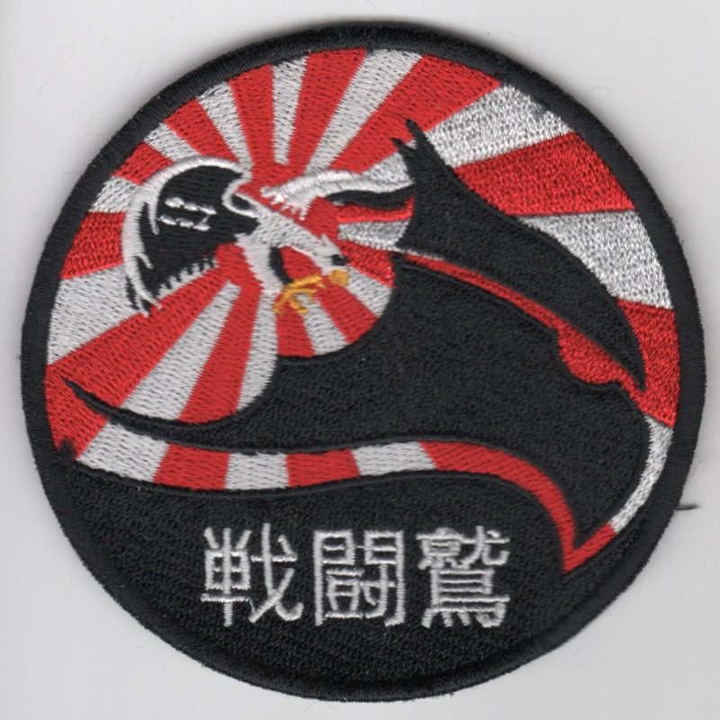 (Korean): For the history and lineage of the 27FS, please note the details above. This patch shows the ‘Raptor’ with it’s Talons in attack position behind the head of a black bird-head with the red-WHITE rays of the setting sun typical of the Pacific theater in the background with (A DIFFERENT THAN ABOVE) Korean script along the bottom. This patch was found in a Korean embroidery shop in very limited quantities and does not come with velcro attached.