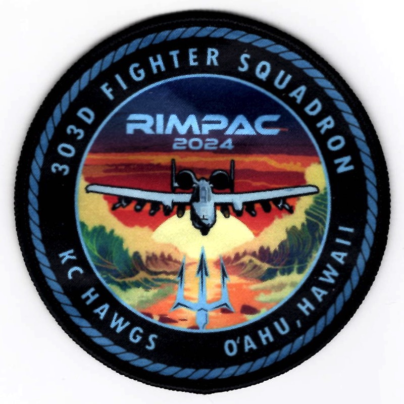 This is the color, woven version of the exercise patch created by the 303rd Fighter Squadron that flies out of Whiteman AFB, MO. More than 800 military personnel converged on Salina, KS and the surrounding area for several weeks to participate in the joint-service exercise, Jaded Thunder. The exercise included joint corps integration by members of Air Force, Marine Corps, Navy and Army units, as well as representatives of the U.S. Special Operations Command. The training provided during Jaded Thunder is essential for national defense. This patch was created by the squadron to commemorate their participation in Exercise RIMPAC 2024 flying out of O’AHU, Hawaii and does not have velcro attached.
