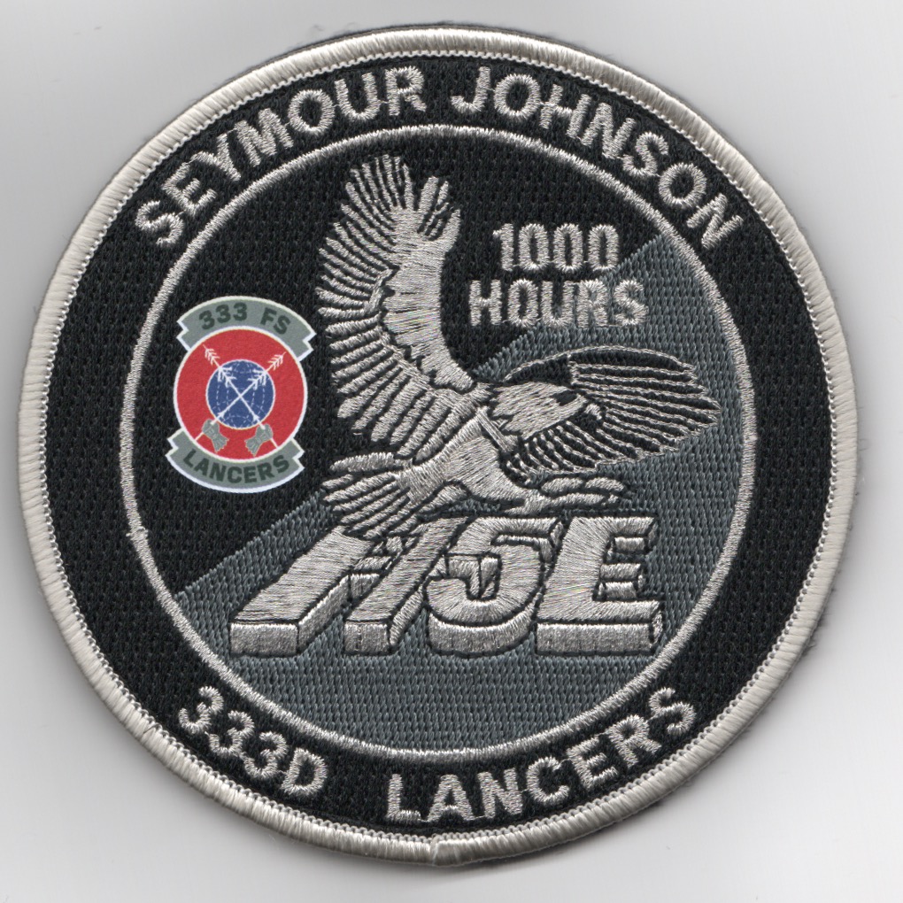 This is the ‘1000 HOURS’, black/silver version of the F-15E “TINSEL” patch for the 333FS, one of the F-15E Strike Eagle training squadrons located at Seymour Johnson AFB, NC. This is worn on the left sleeve of the flight suit and does come with velcro already attached.