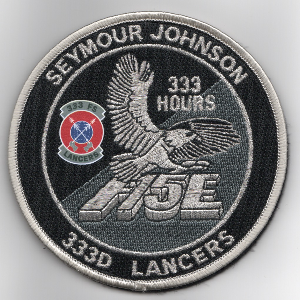This is the ‘333 HOURS’, black/silver version of the F-15E “TINSEL” patch for the 333FS, one of the F-15E Strike Eagle training squadrons located at Seymour Johnson AFB, NC. This is worn on the left sleeve of the flight suit and does come with velcro already attached.